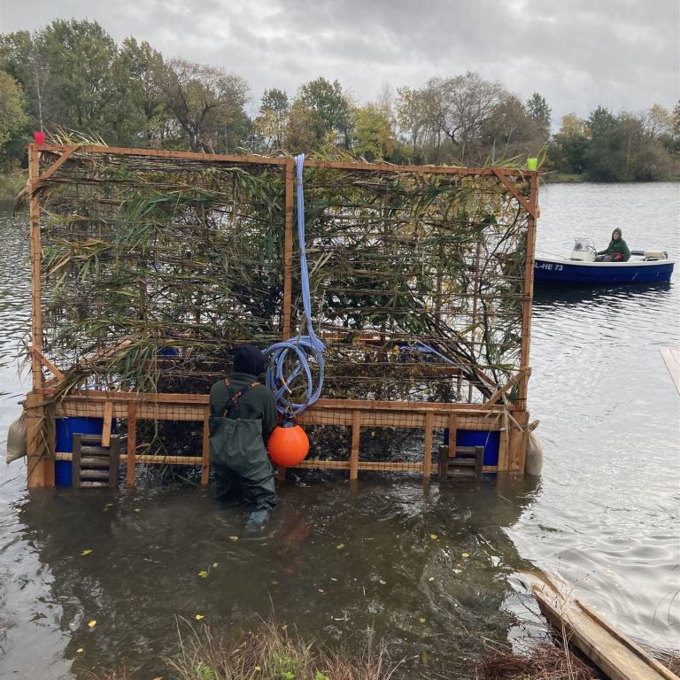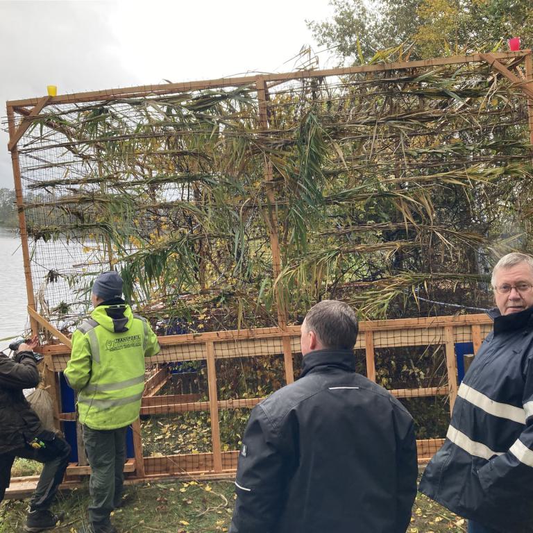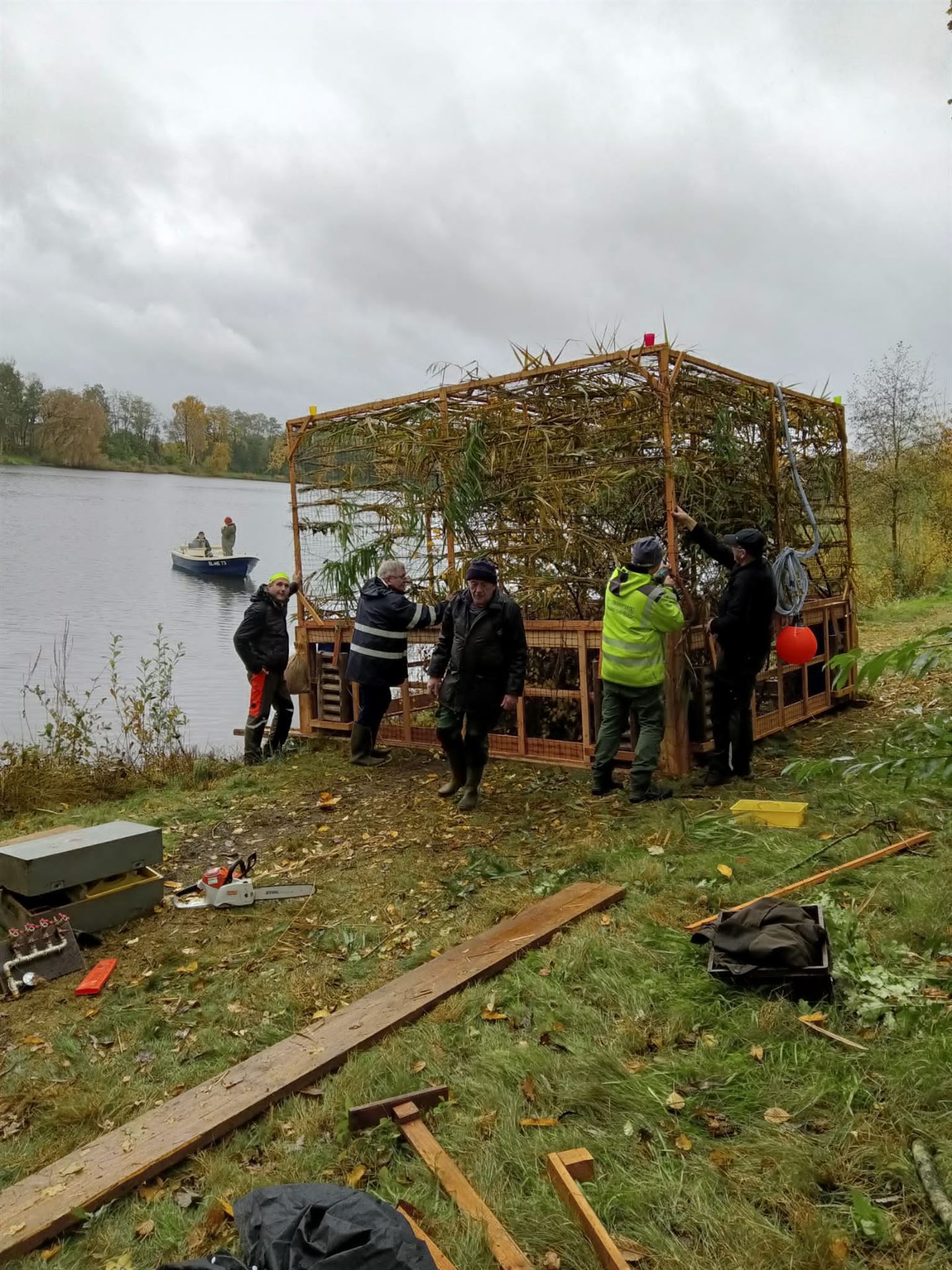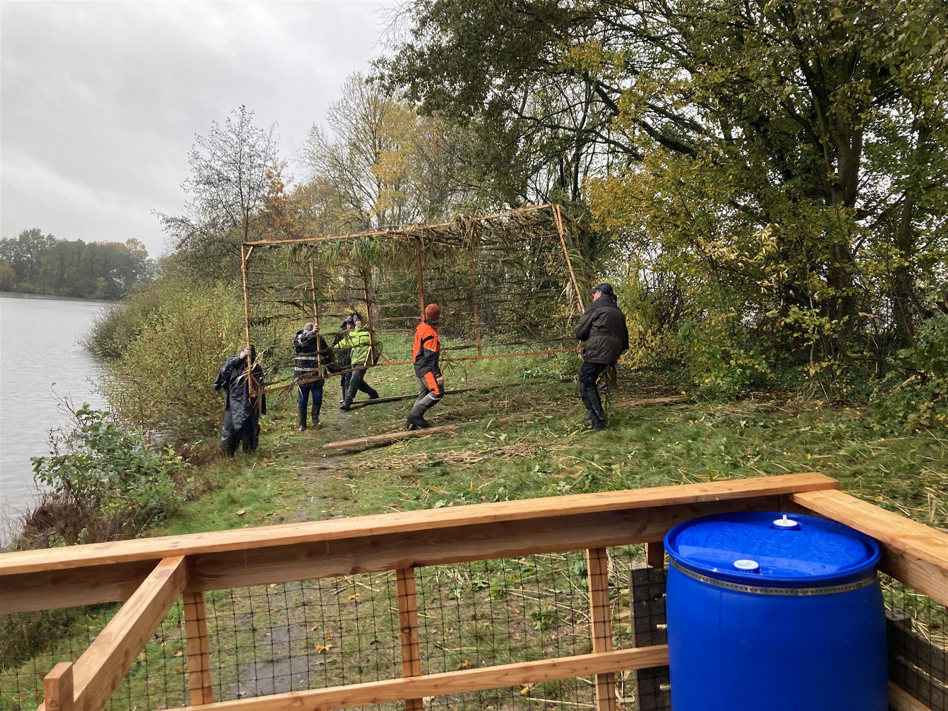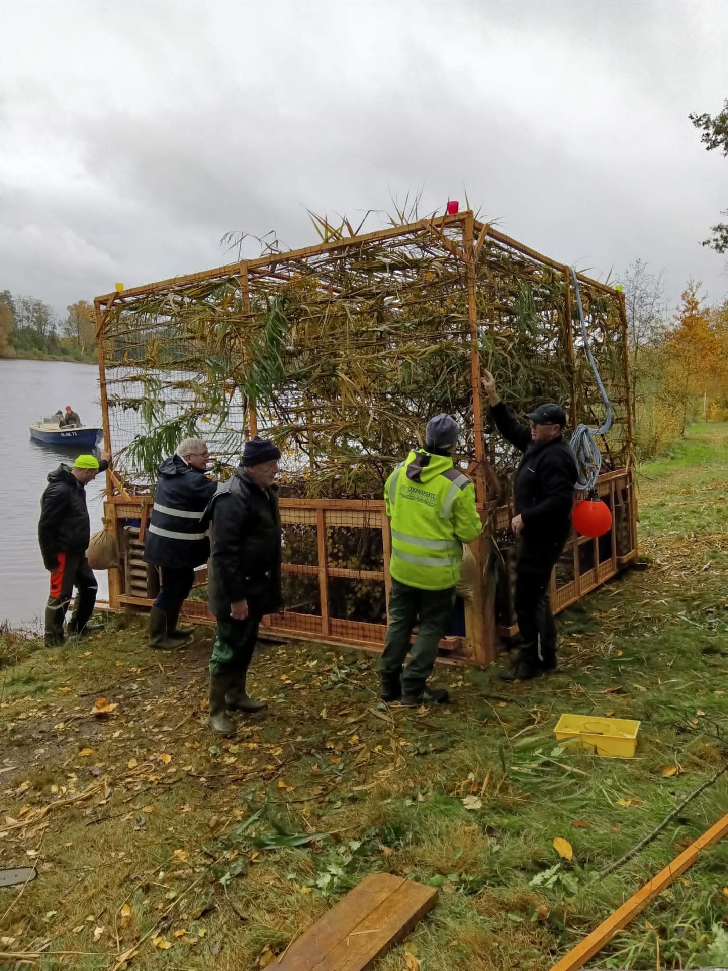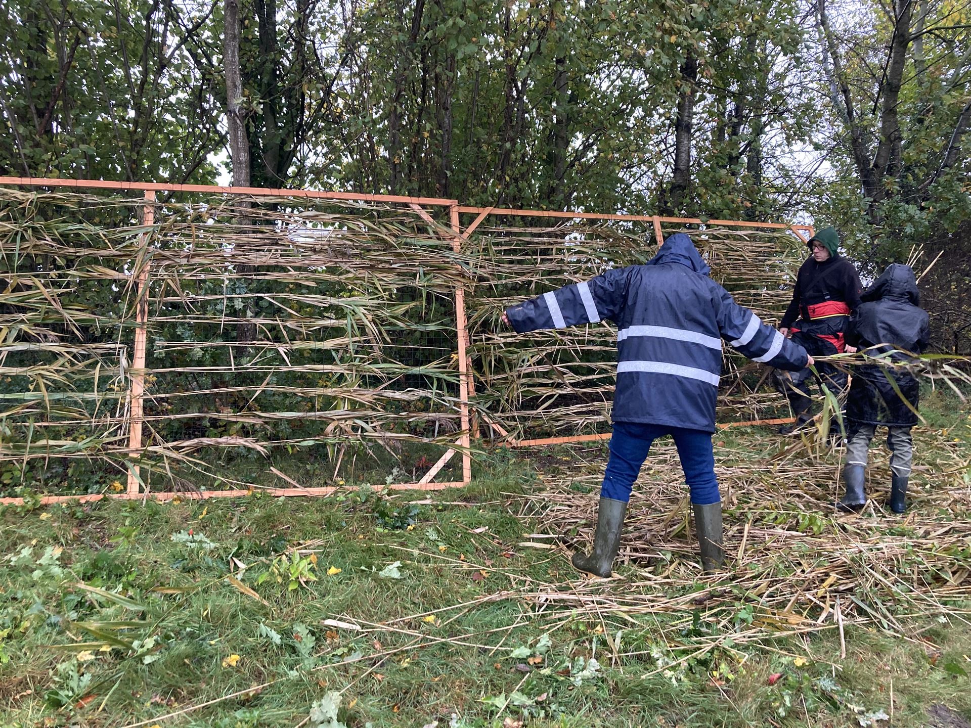 In das Netz wurde von den eifrigen Helfern bei widrigen Wetterbedingungen mühselig frisch geschnittenes Schilf eingeflochten, um das ganze etwas abzudunkeln, damit die Fische dies als Schutzzone wahrnehmen.