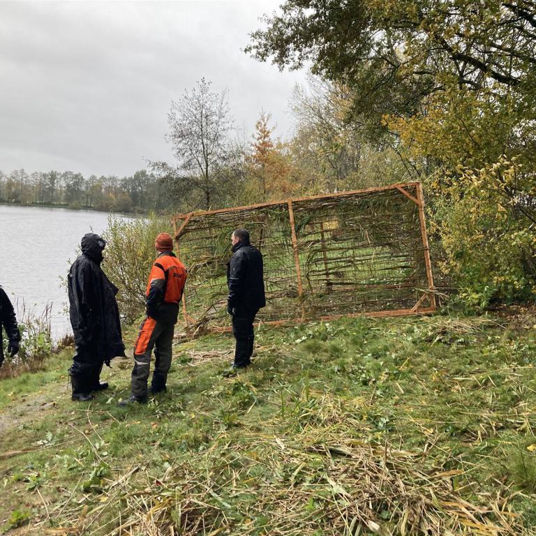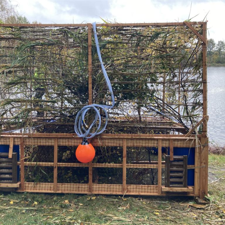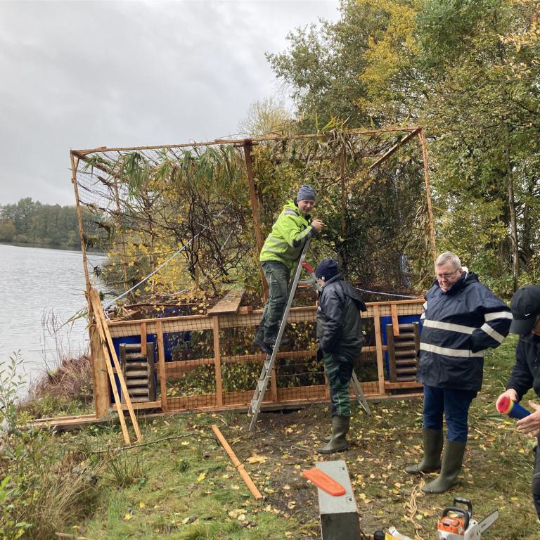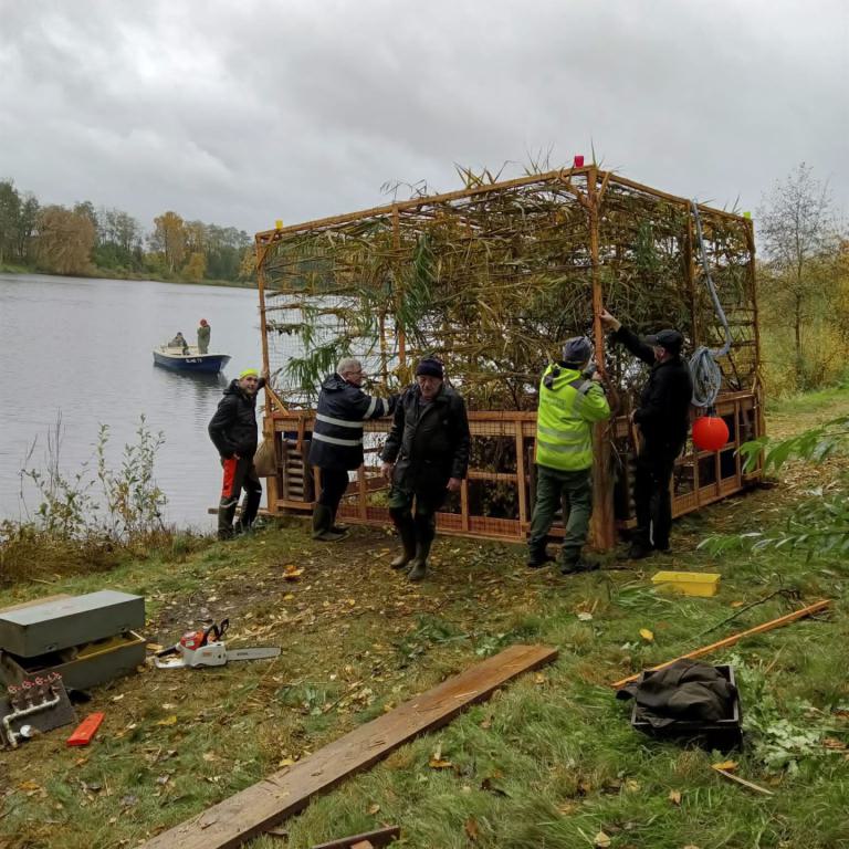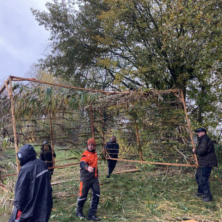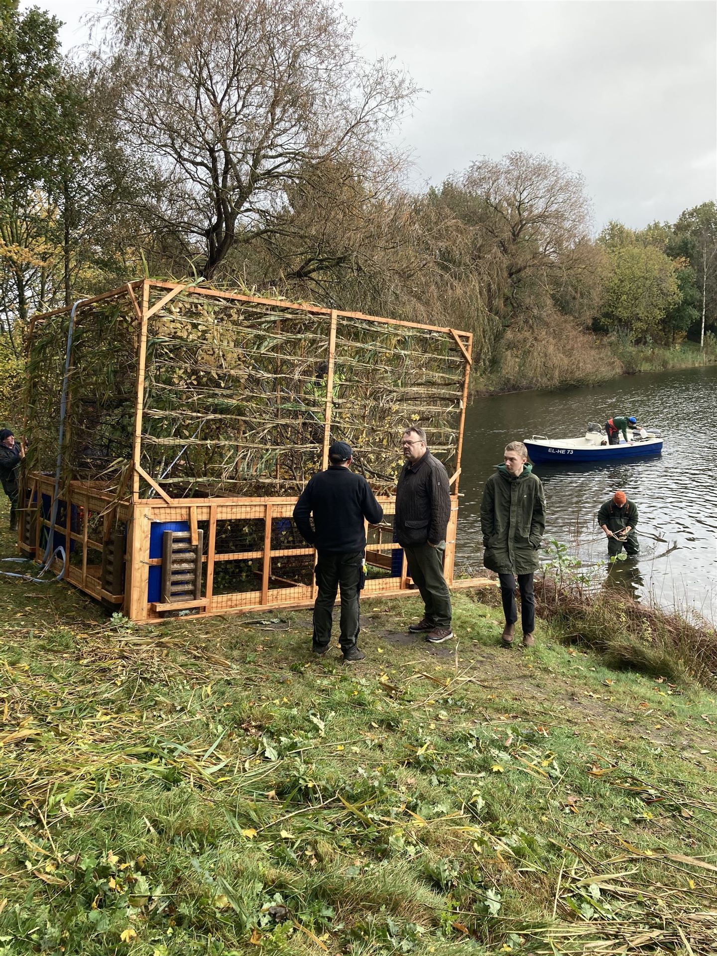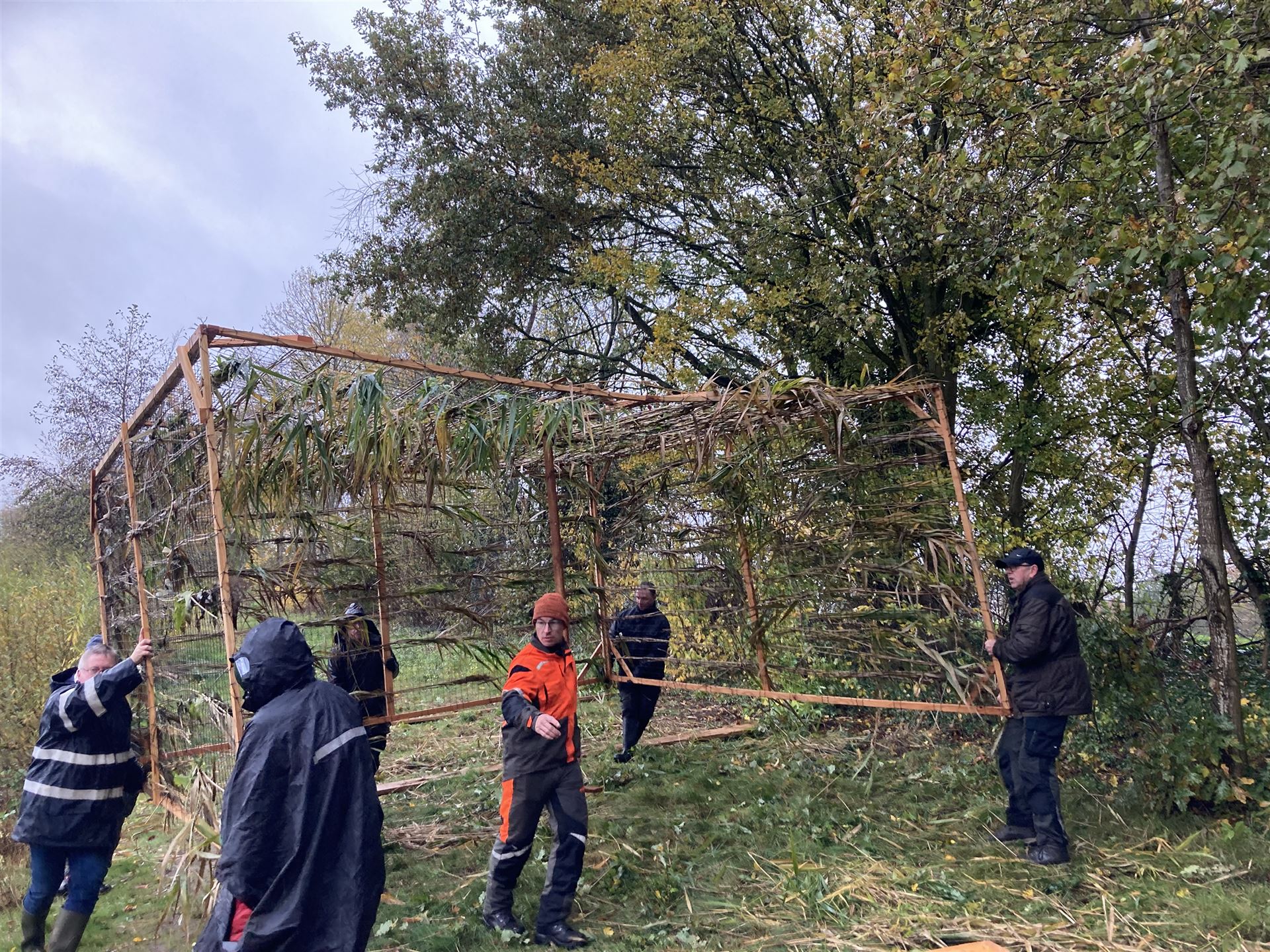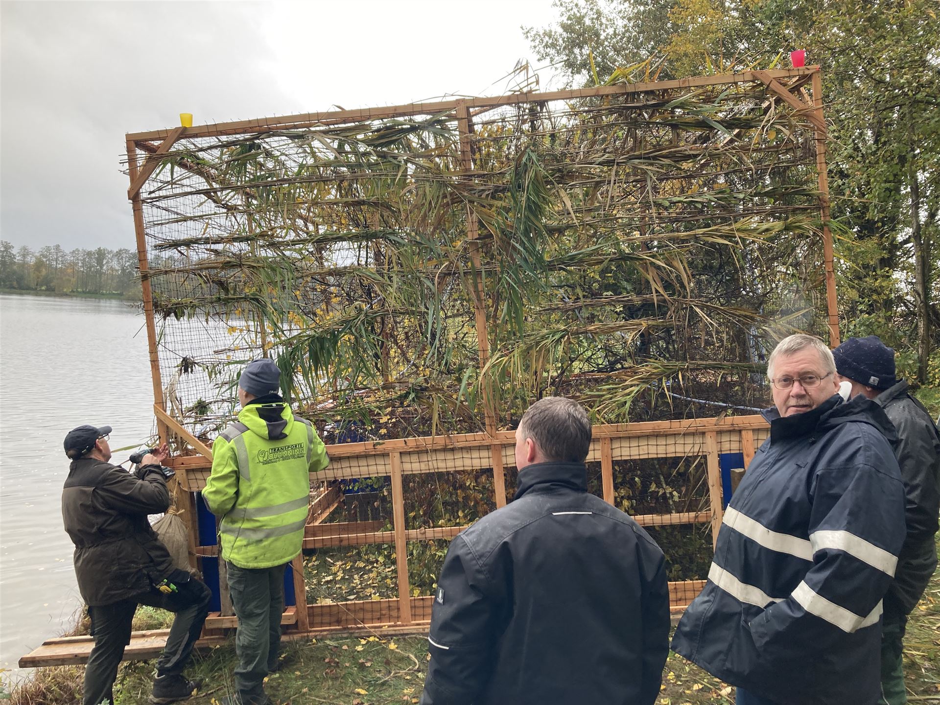 In das Netz wurde von den eifrigen Helfern bei widrigen Wetterbedingungen mühselig frisch geschnittenes Schilf eingeflochten, um das ganze etwas abzudunkeln, damit die Fische dies als Schutzzone wahrnehmen.