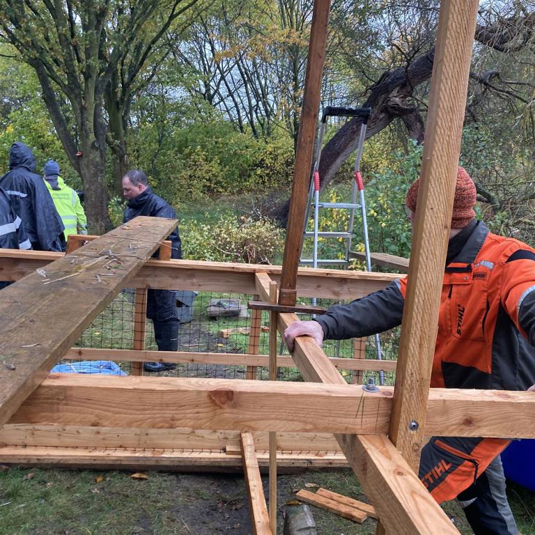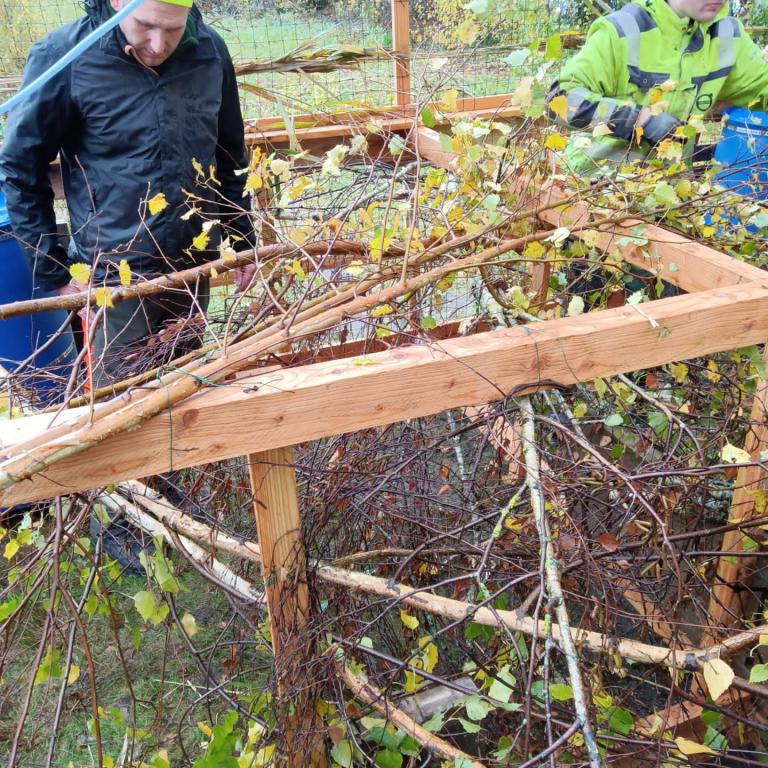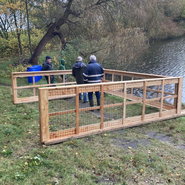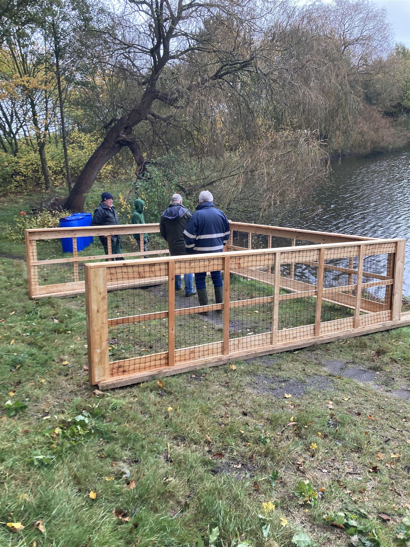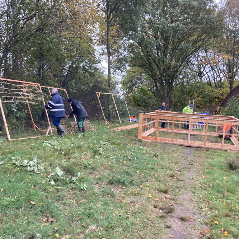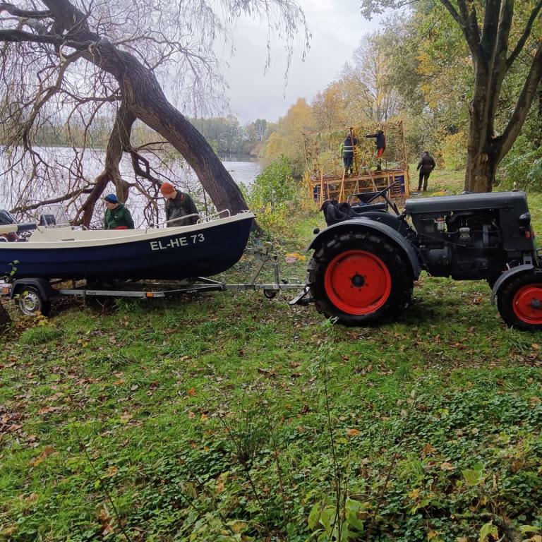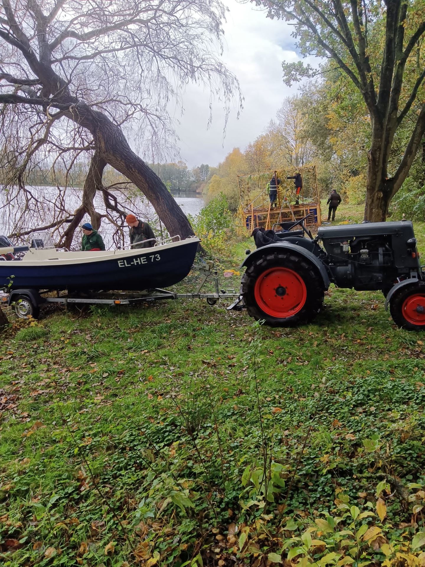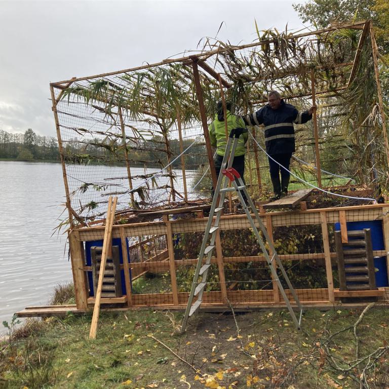 In das Netz wurde von den eifrigen Helfern bei widrigen Wetterbedingungen mühselig frisch geschnittenes Schilf eingeflochten, um das ganze etwas abzudunkeln, damit die Fische dies als Schutzzone wahrnehmen.