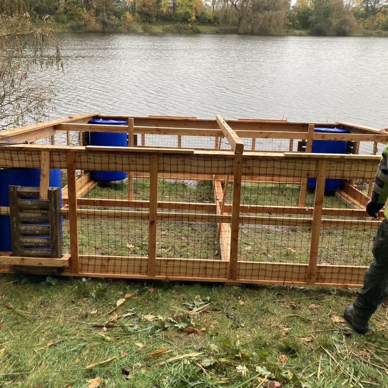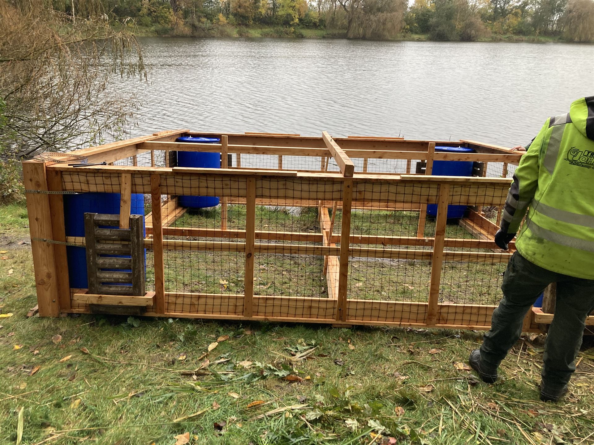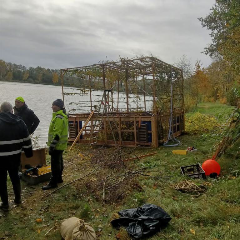 Diese Konstruktion besteht aus beständigem Lärchenholz, 4x4x3 Meter groß. Der Holzrahmen ist mit einem grobmaschigen Netz umgeben. Das Netz ist für kleinere und schlanke Fische, die ins Beuteschema u.a. vom Kormoran passen, ohne Probleme passierbar. Der Kormoran, der übrigens bis zu knapp 20m Wassertiefe tauchen kann, um auf Beutefang zu gehen, wird durch das Netz abgehalten und die Schutz suchenden Fische sind in Sicherheit.