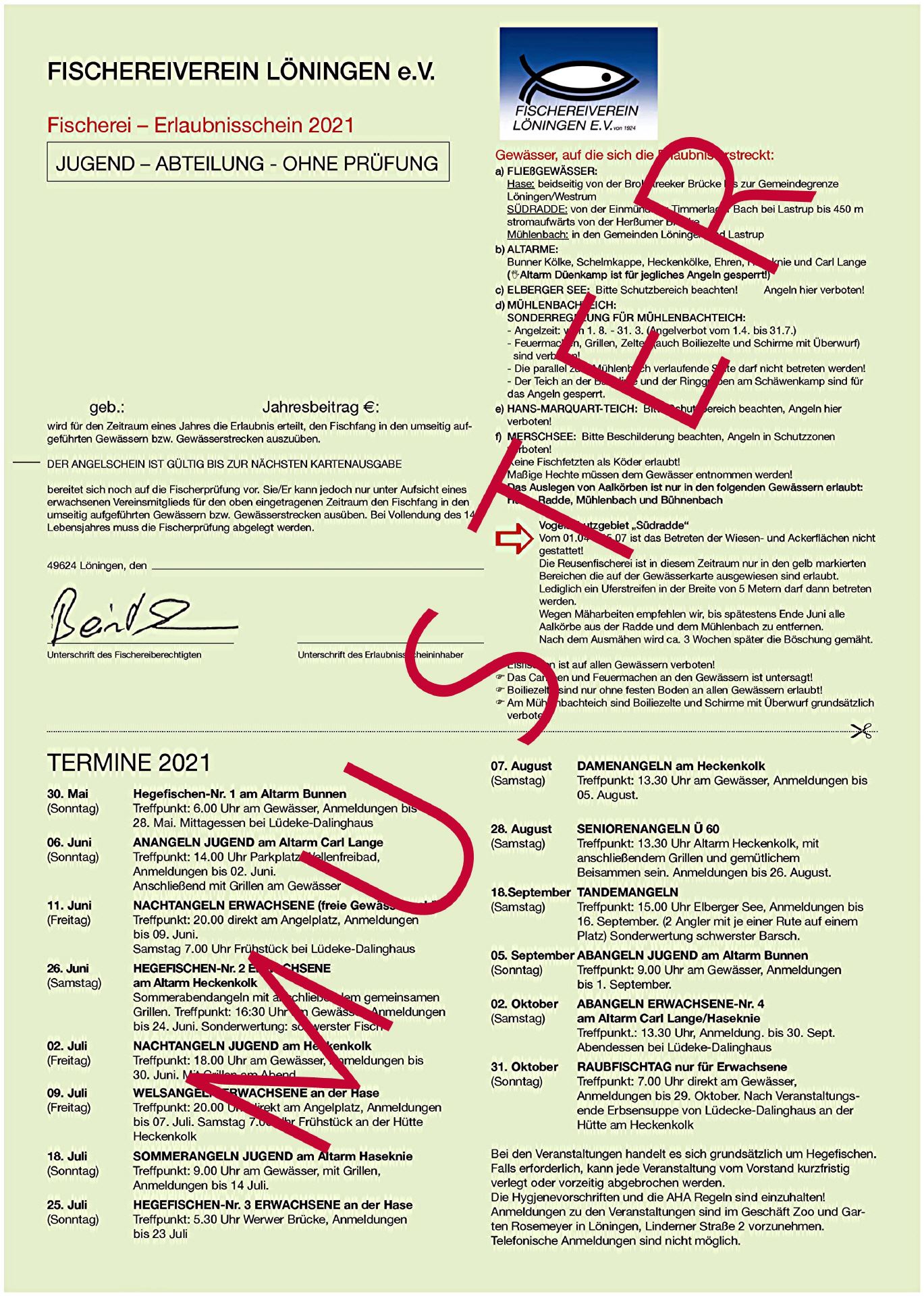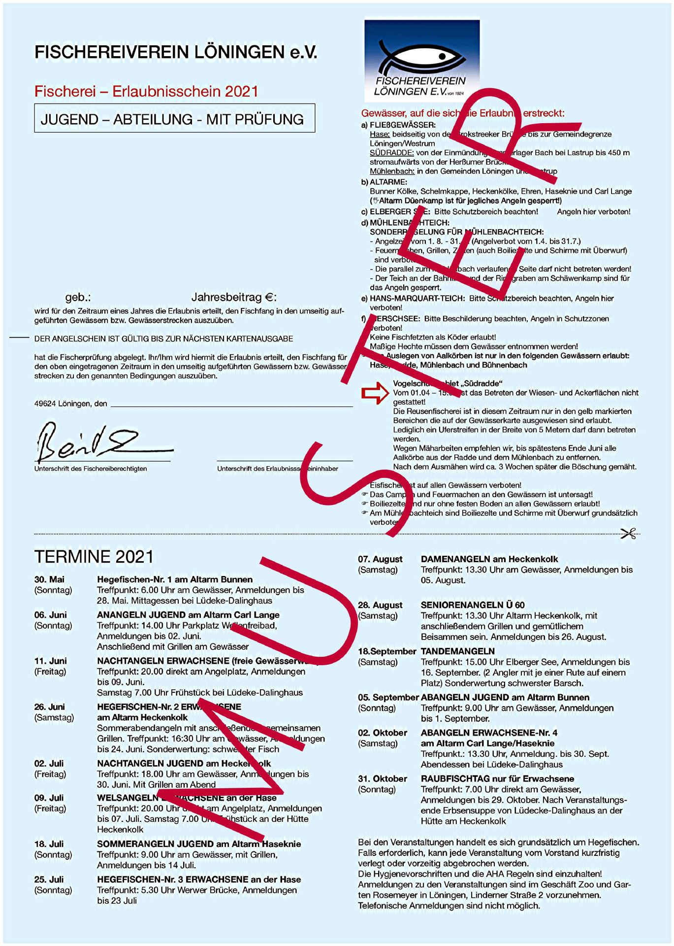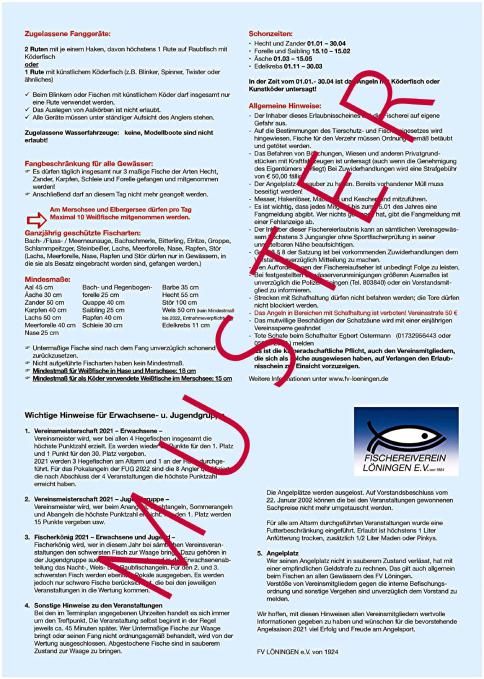 Der Fischereierlaubnisschein wird vom Fischereiverein Löningen e.V. als Fischereiberechtigten gegen Zahlung der Jahresgebühr ausgegeben.