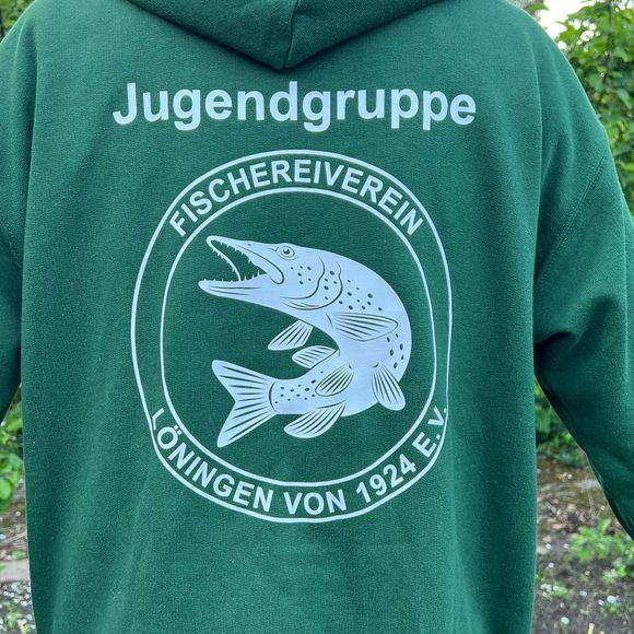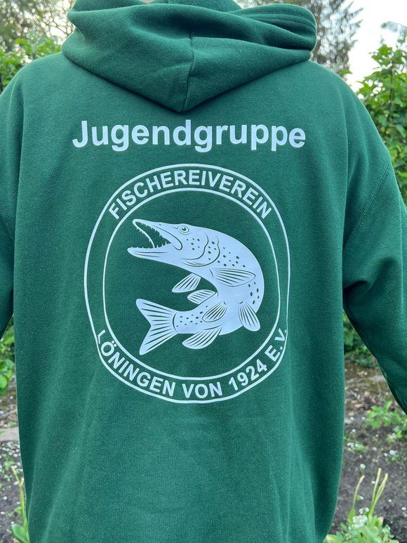 Zu Beginn musste erstmal ein Design für die neuen Kapuzenpullover entworfen werden. Hierbei haben wir uns an unser ehemaliges, kreisrundes Vereinslogo mit raubendem Hecht orientiert. Dieses Logo wurde durch die Fa. DiPrint Löningen noch leicht modifiziert und schmückt nun die Rückseite der Hoodies. Für eine bessere Wiedererkennung wurde zusätzlich der Schriftzug „Jugendgruppe“ oberhalb des Logos angebracht. Die Vornamen der jeweiligen Jungangler finden sich auf der Vorderseite. Mit dem gewählten Farbdesign in Dunkelgrün wird zudem unser naturverbundenes Hobby nochmals besonders betont.