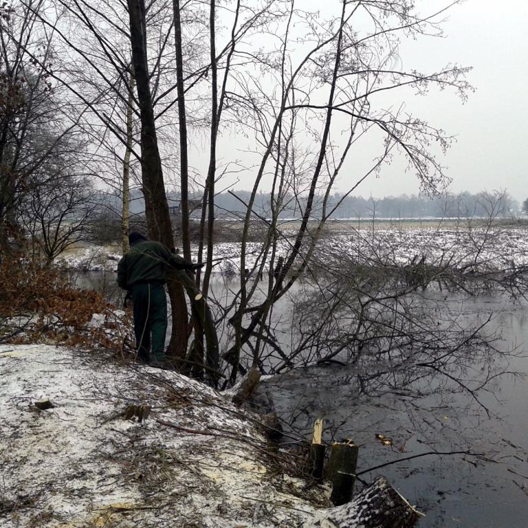 Zum Jahresbeginn wurden hier die notwendigen Abholzungsarbeiten durchgeführt. Die erforderlichen Arbeiten wurden durch eine Gruppe von Vereinsmitgliedern geleistet. Anfang März konnten dann die erforderlichen Baggerarbeiten begonnen werden. Zur Verbesserung der ökologischen Verhältnisse erhielt die Laichzone eine bessere Anbindung und wurde auf voller Breite mit dem Altarm verbunden. Zusätzlich wurde der Gewässerboden vom Faulschlamm befreit, so dass die ursprüngliche Gewässersohle wieder freigelegt wurde. Das gesamte bei den Fällarbeiten angefallene Strauch- und Astwerk wurde umweltfreundlich verwertet. Als sog. Benjes-Hecke wurde es auf der Uferböschung aufgeschichtet. Sie dient besonders der Vogelwelt als Nahrungs- und Nistrevier sowie als Unterschlupfmöglichkeit.