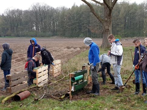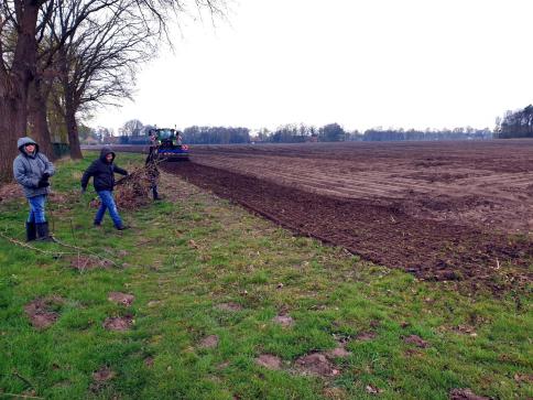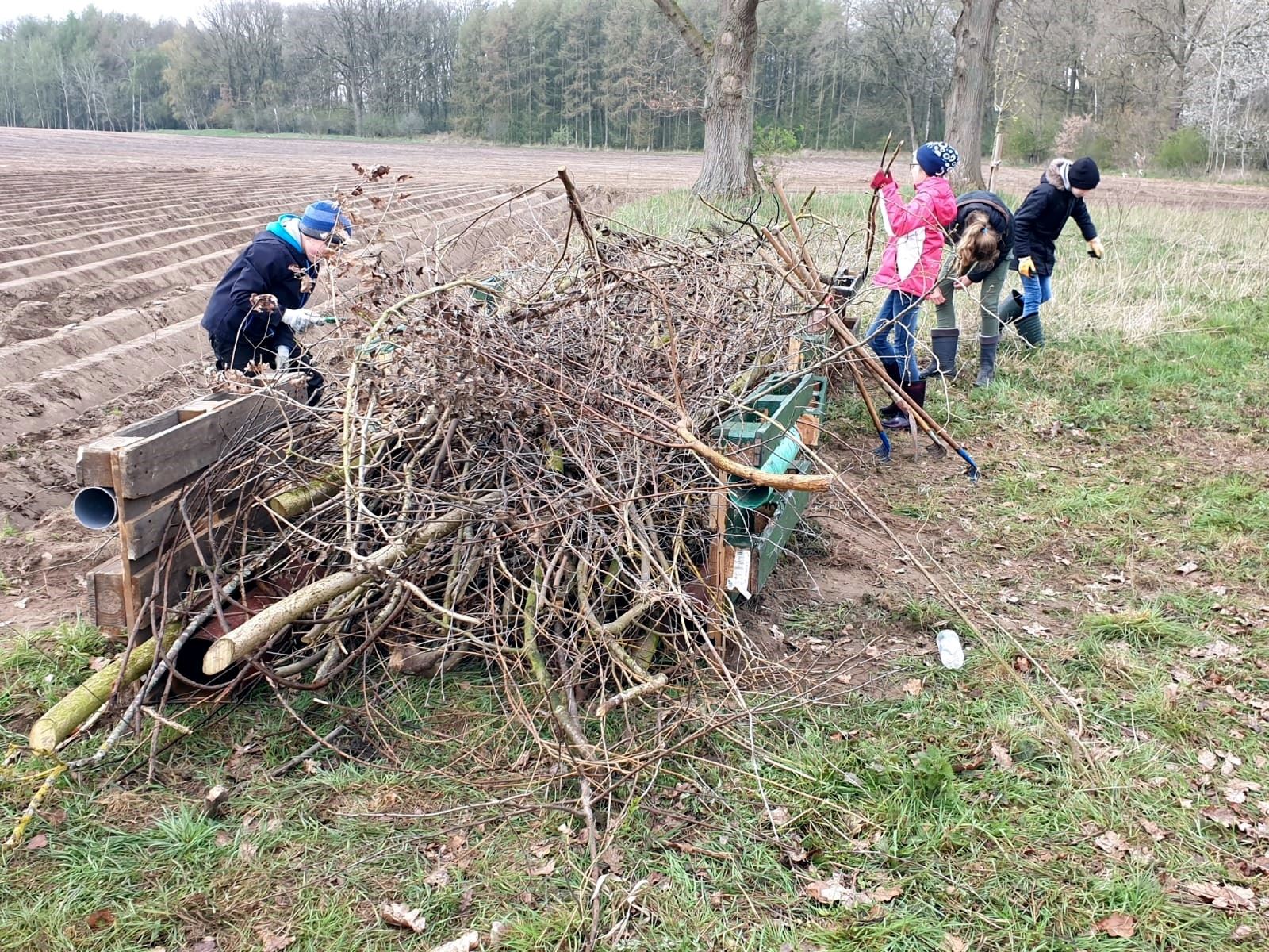 Parallel zu dieser Aktion bauten Jungangler am Rand der Ackerfläche eine kleine Totholzhecke aus Holzpaletten und Strauchschnitt auf. Dabei wurden Paletten mit einem Abstand von 70 Zentimeter der Höhe nach senkrecht gegenüber gestellt und stabil in der Erde verankert. Der Zwischenraum wurde mit kleineren und größeren Zweigen und Ästen befällt und etwas zusammengedrückt. Nach einiger Zeit kann dann Strauchschnitt nachgefüllt werden - das zuunterst liegende Material verrottet zu Humus. Zwischen den Zweigen finden Heckenbrüter, Igel, Frösche, Kröten und viele Insekten Schutz und Nahrung. An den Palettenaußenseiten sollen noch zur Begrünung einjährige Kletterpflanzen, wie z.B. Kapuzinerkresse, eingesät werden.