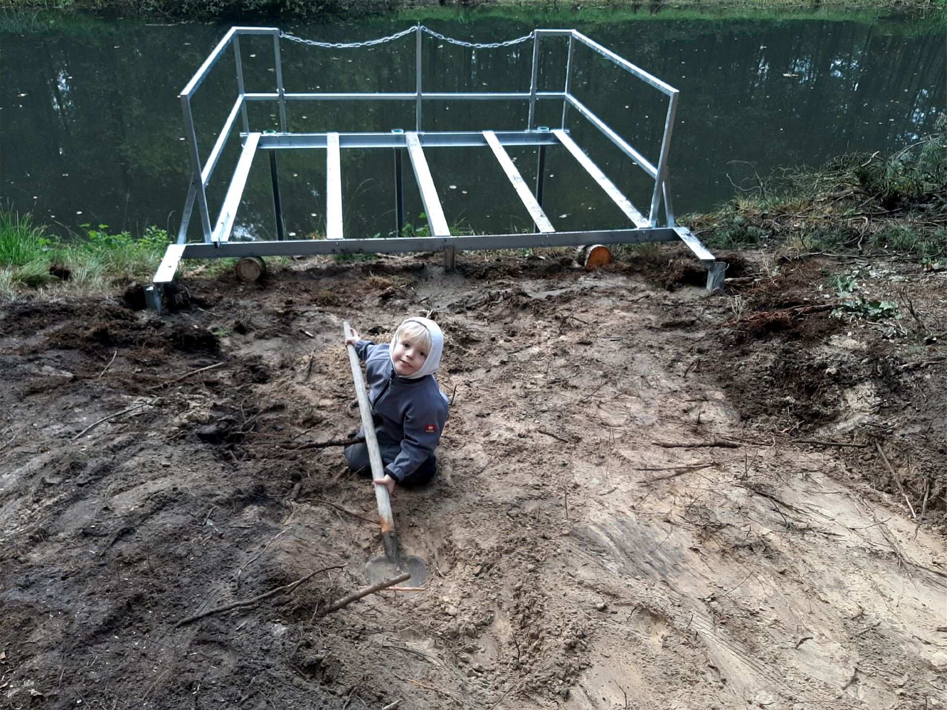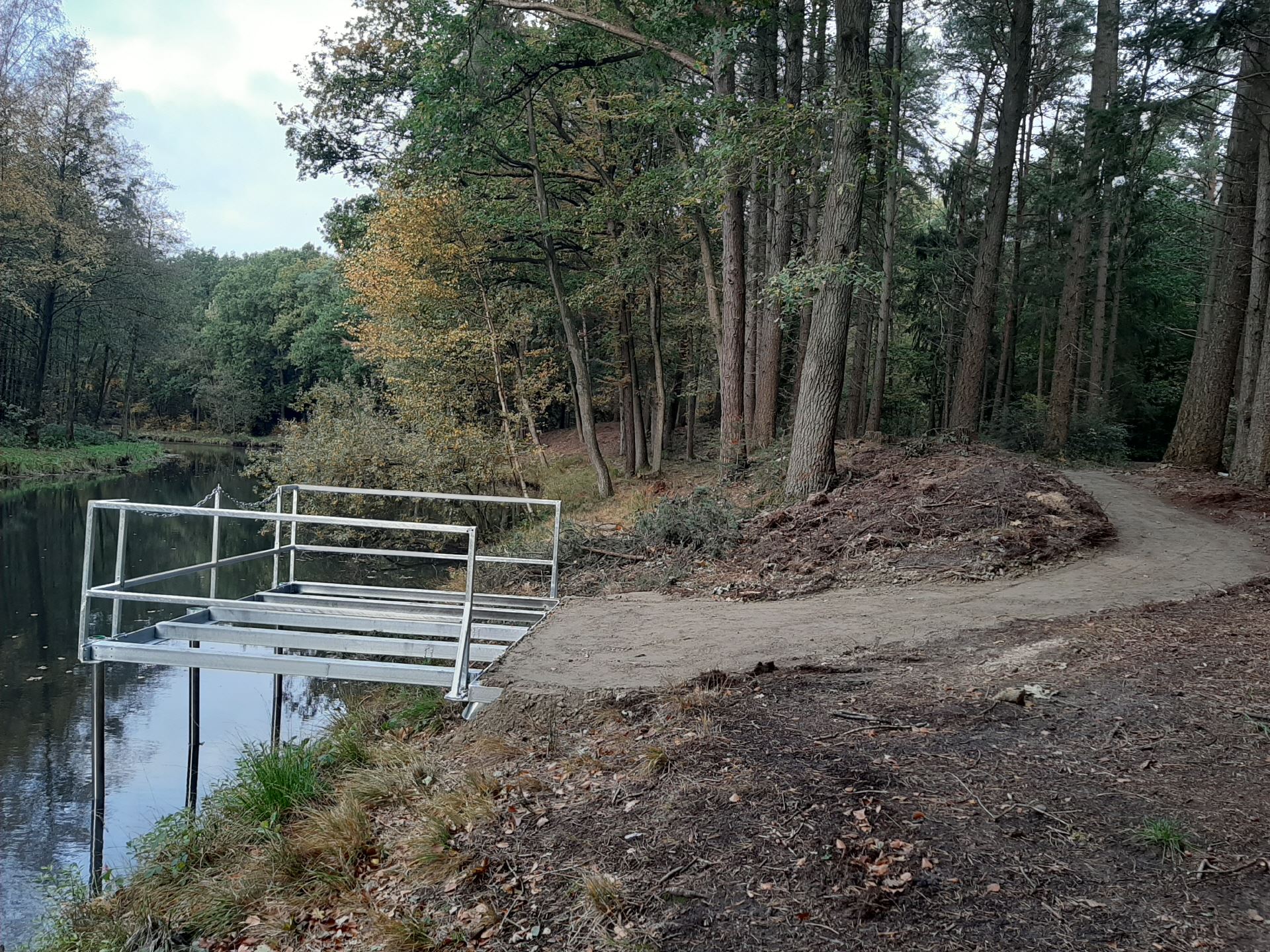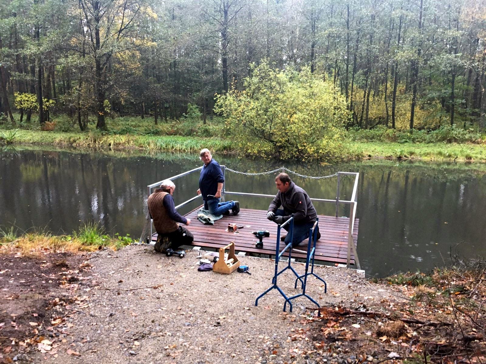 Sind Angelplätze für Rollstuhl- und Rollatornutzer vorgesehen, müssen nach einer Norm, der DIN 18040-4: 2014-12, Mindeststandards zu solchen Angelplätzen erfüllt sein: Rollstuhlfahrer müssen ebenerdig ohne Hilfe auf die Plattform fahren können. Dazu wurde ein ausreichend breiter Weg mit einer möglichst geringen Steigung angelegt. Um den behinderten Anglern das Ein- und Auspacken der Ausrüstung zu erleichtern, kann der Platz mit dem Auto direkt angefahren werden; auch eine Parkmöglichkeit ist vorhanden. Die Planung und Anfertigung der Metallkonstruktion erfolgten in enger Zusammenarbeit mit der Fa. Heimbrock aus Benstrup. Die Plattform wurde größer als die in der DIN vorgesehenen 1,8 x 1,5 m gewählt, um auch einem Helfer bzw. Helferin ausreichend Platz zu bieten. Die Arbeiten vor Ort wurden von mehreren Vorstandsmitgliedern bewerkstelligt; maßgeblich dabei auch Jürgen Frilling, der für den Maschineneinsatz verantwortlich zeigte.