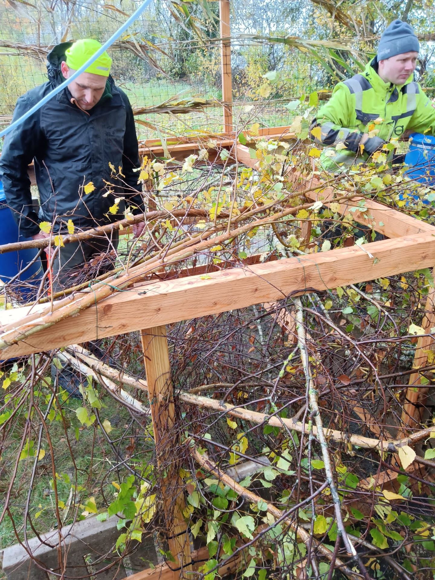 In das Netz wurde von den eifrigen Helfern bei widrigen Wetterbedingungen mühselig frisch geschnittenes Schilf eingeflochten, um das ganze etwas abzudunkeln, damit die Fische dies als Schutzzone wahrnehmen.
