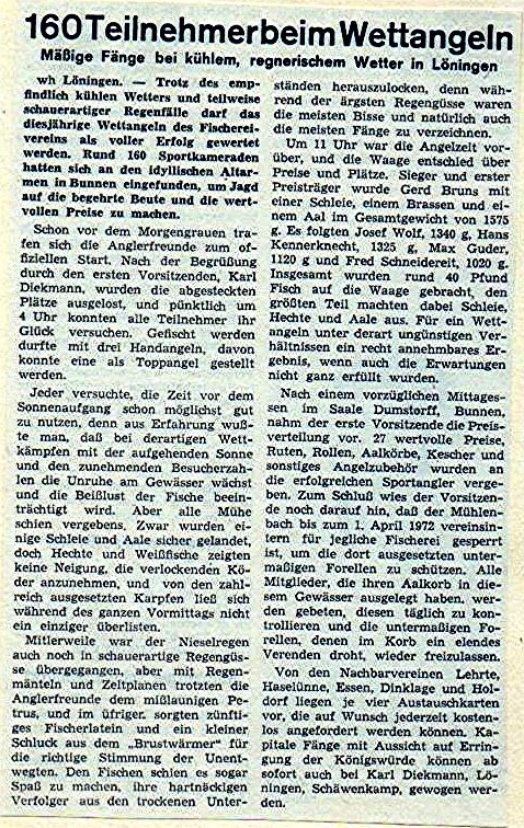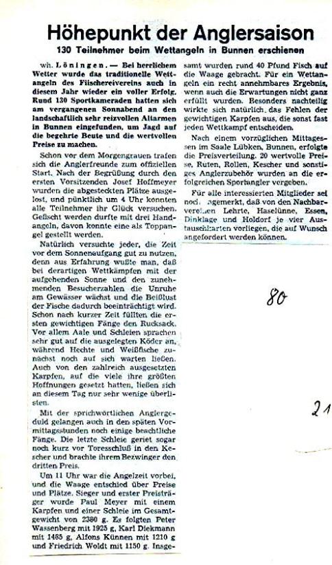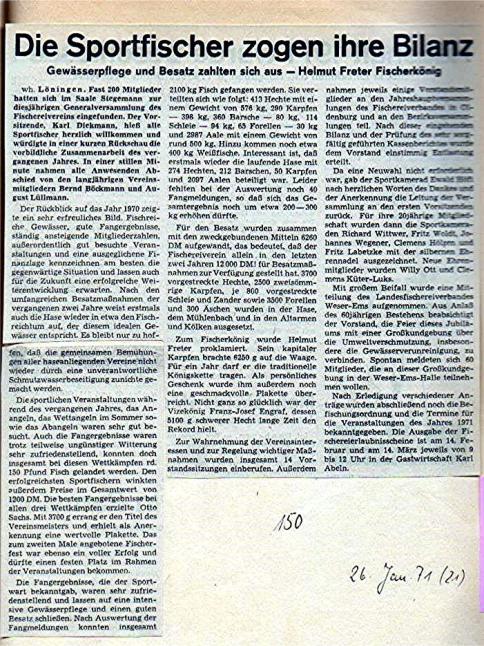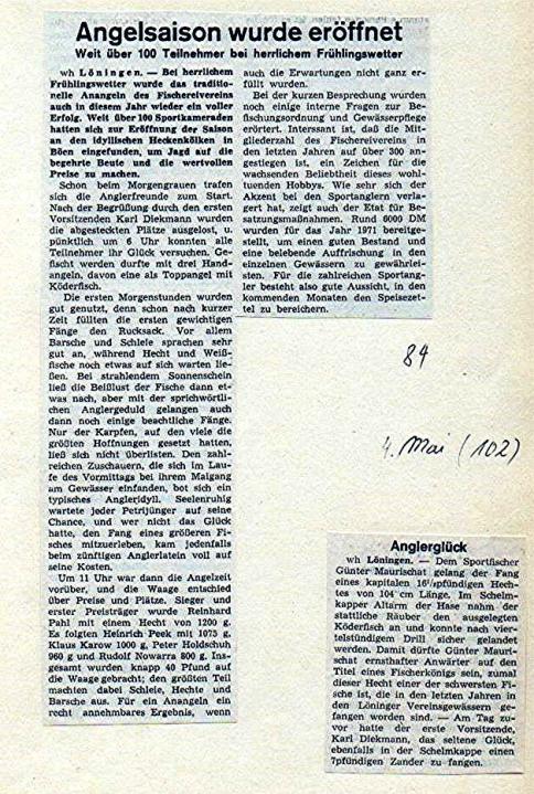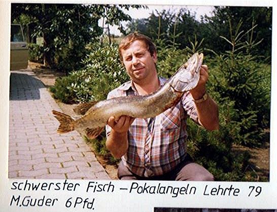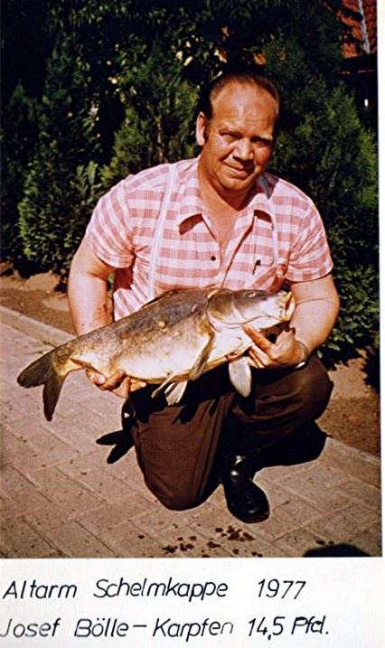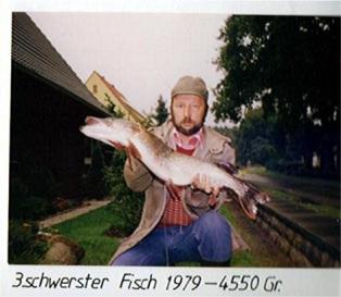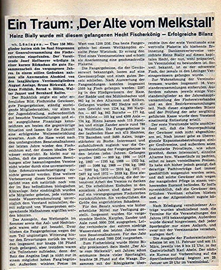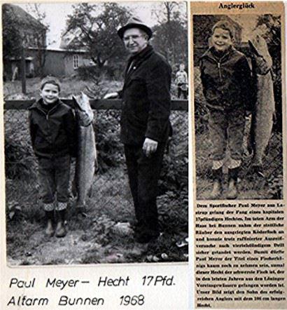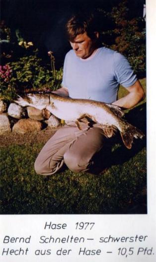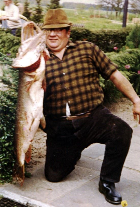 Pfingsten 1972: Der schwerste Hecht der Vereinsgeschichte(1,13 m = 26 Pfund), gefangen von Heinz Bially im Bunner Altarm