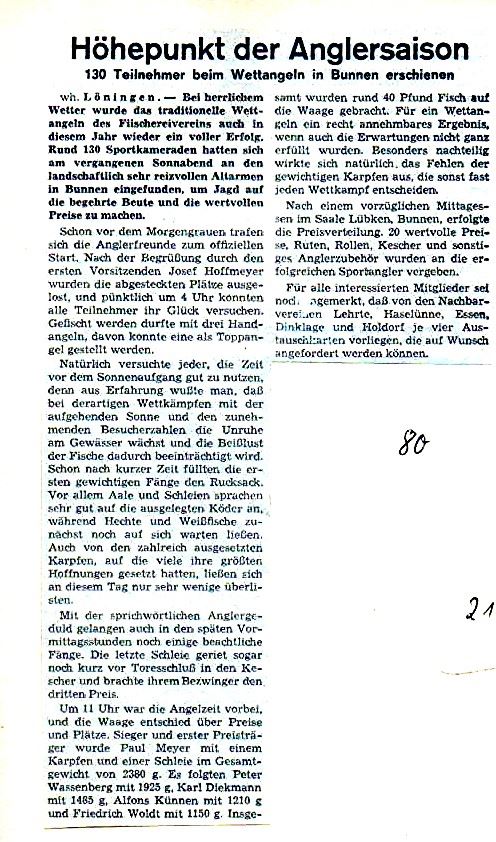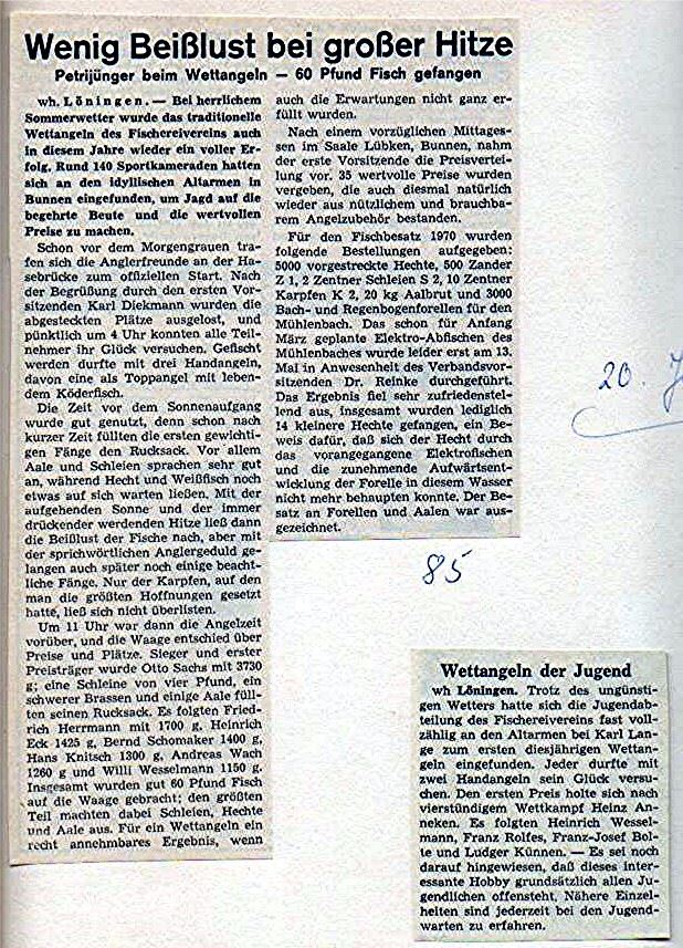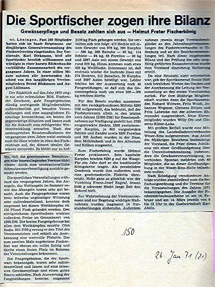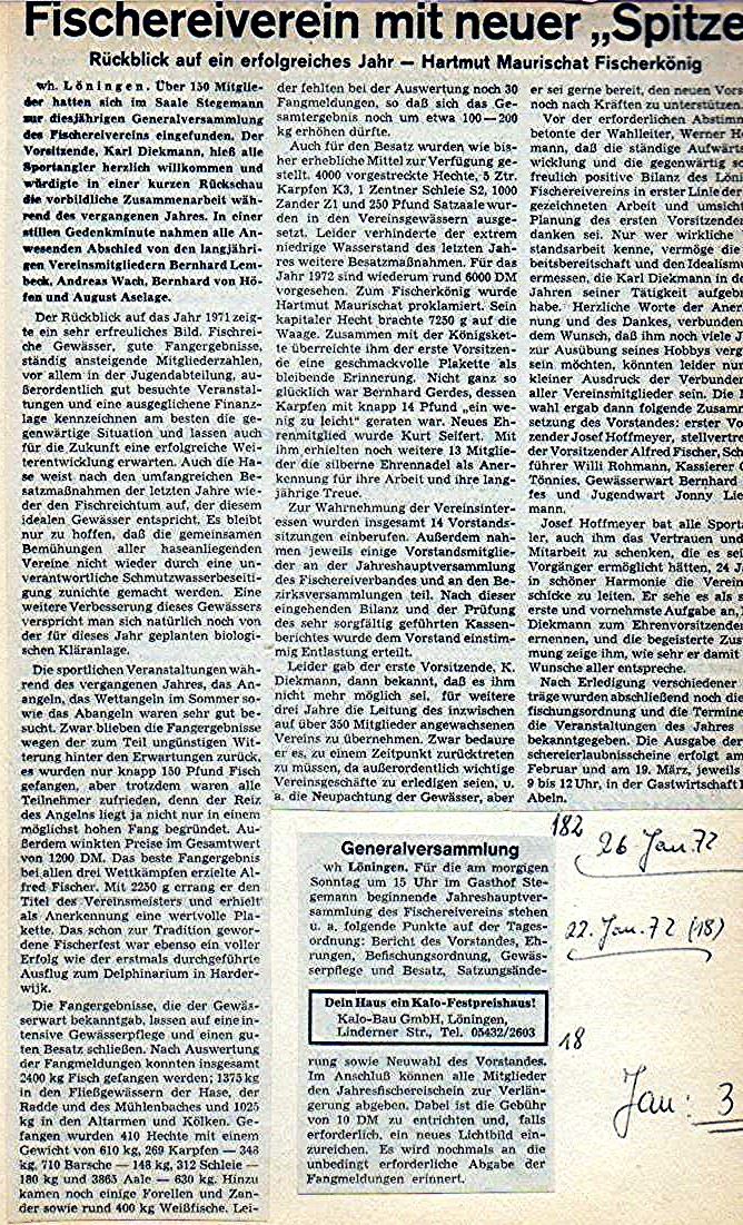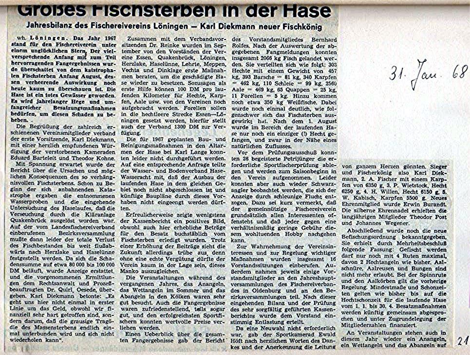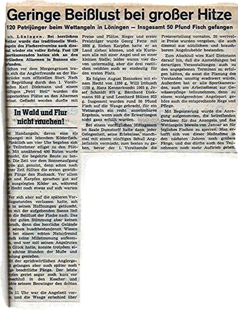 Beträchtliche Schäden richtete der Schneewinter 1978/79 in den Gewässern des Fischereivereins Löningen an. Große Mengen Fische waren durch den langen Eisgang und durch die Schneedecke, die das Wasser abdunkelte, erstickt. So war keine Sauerstofferzeugung durch Unterwasserpflanzen mehr möglich.